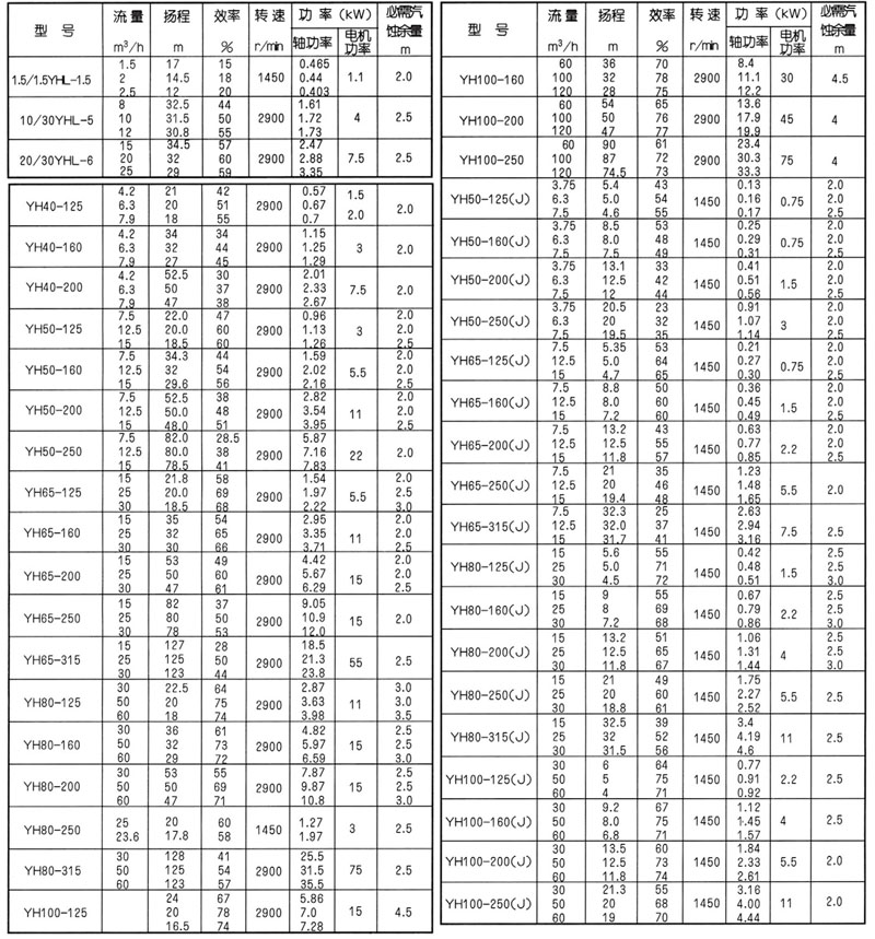 YH和YHL係列泵是單級、單吸、液下式離心泵(1.5/1.5YHLI.5是旋渦泵),流量範圍1.5~120m/h;揚程範(fàn)圍2.5~127m。用於汲送井罐中不含固體顆粒、無腐蝕性的介質(如發煙硫酸)。介質最高溫度80℃。