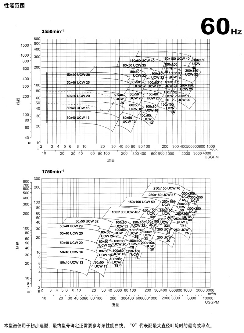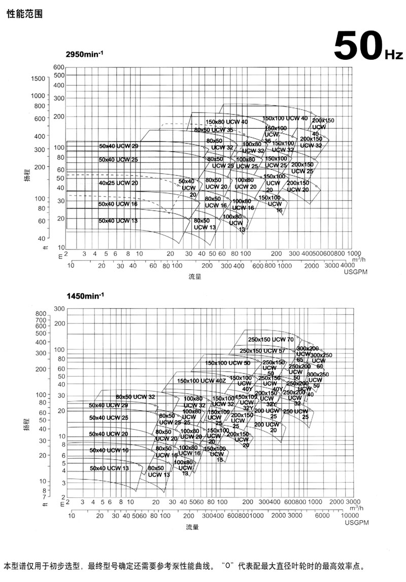 (·2)當葉(yè)輪直(zhí)徑代碼後有字母“Y”。“Z”時表示不同的葉輪和泵體設計。例如(rú),150×100 UCWM 400,150X100 UCWM 40Y.