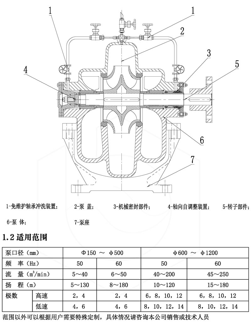 對於揚程(chéng)較低的中開泵,使用(yòng)單殼體結構。為了減小泵(bèng)在運行(háng)時(shí)產生(shēng)的壓力脈動,泵的壓(yā)水室隔舌設計呈傾斜形狀(zhuàng)。